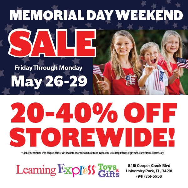 Join us this Memorial Day Weekend for a 20-40% off Storewide Sale! Bring the kids out to see Mickey Mouse Saturday, Sunday and Monday from 1-3PM! Memorial Day savings on the best brands. Save 20% or more on all of your favorites. We have the best selection of Legos and Sqishmallows is the area.