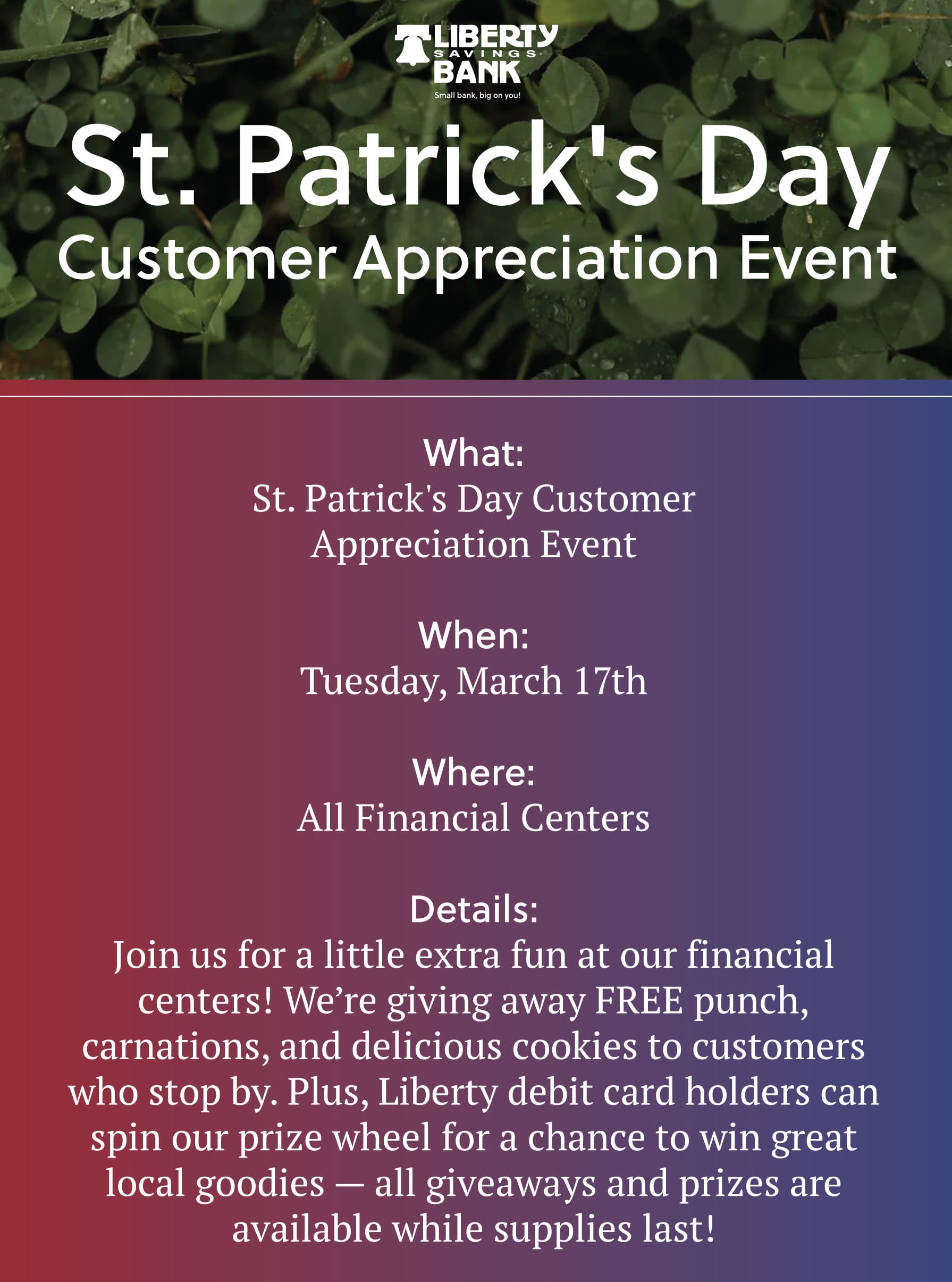 You’re invited to our St. Patrick’s Day Customer Appreciation Event! 🍀 Join Liberty Savings Bank on Tuesday, March 17th at all Financial Centers for a little extra fun as we celebrate our amazing customers. We’re giving away FREE punch, carnations, and delicious cookies to customers who stop by! Plus, Liberty debit card holders can spin our prize wheel for a chance to win great local goodies — all giveaways and prizes are available while supplies last. We’re feeling lucky to serve you and can’t wait to celebrate together! 💚